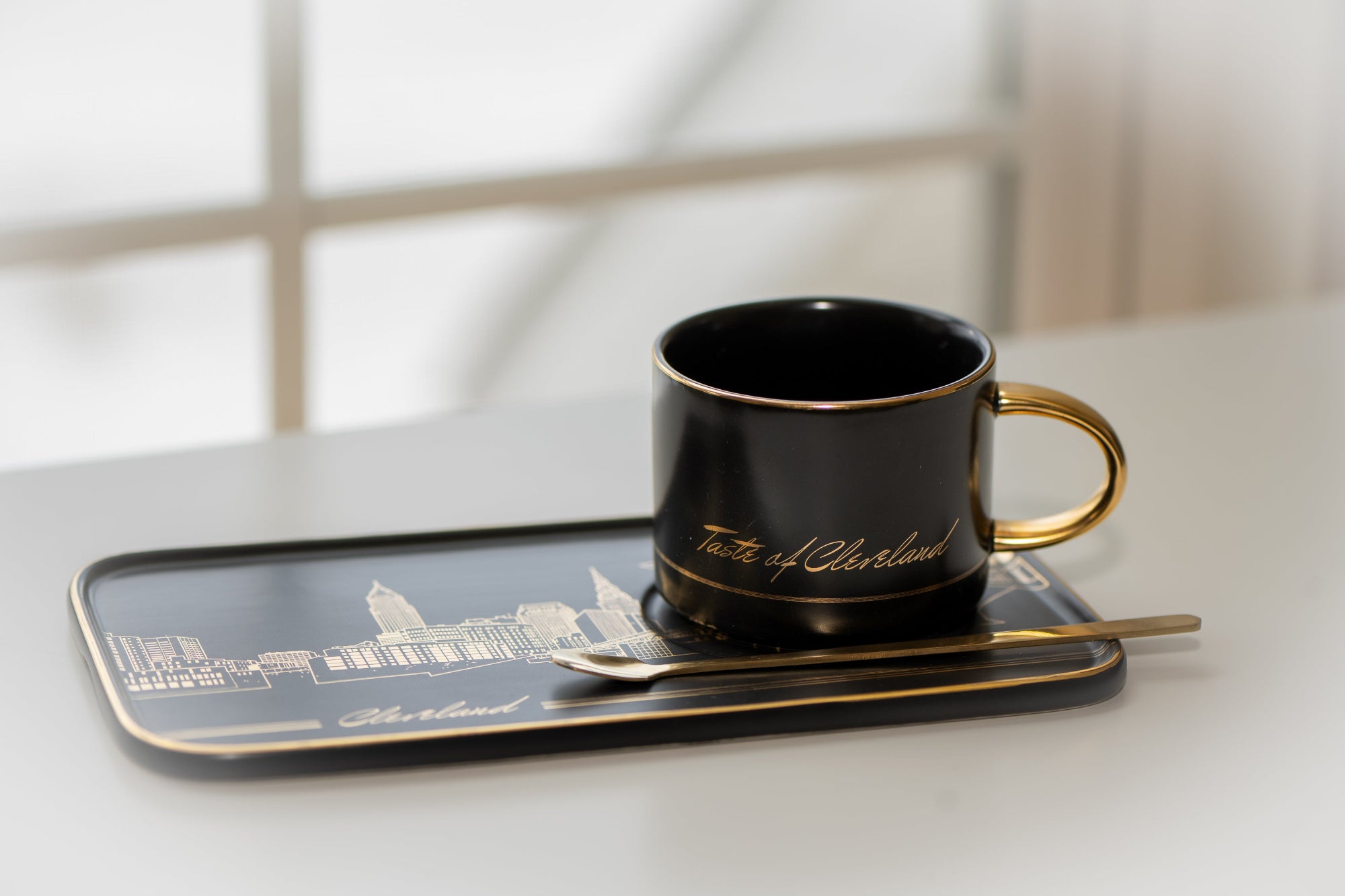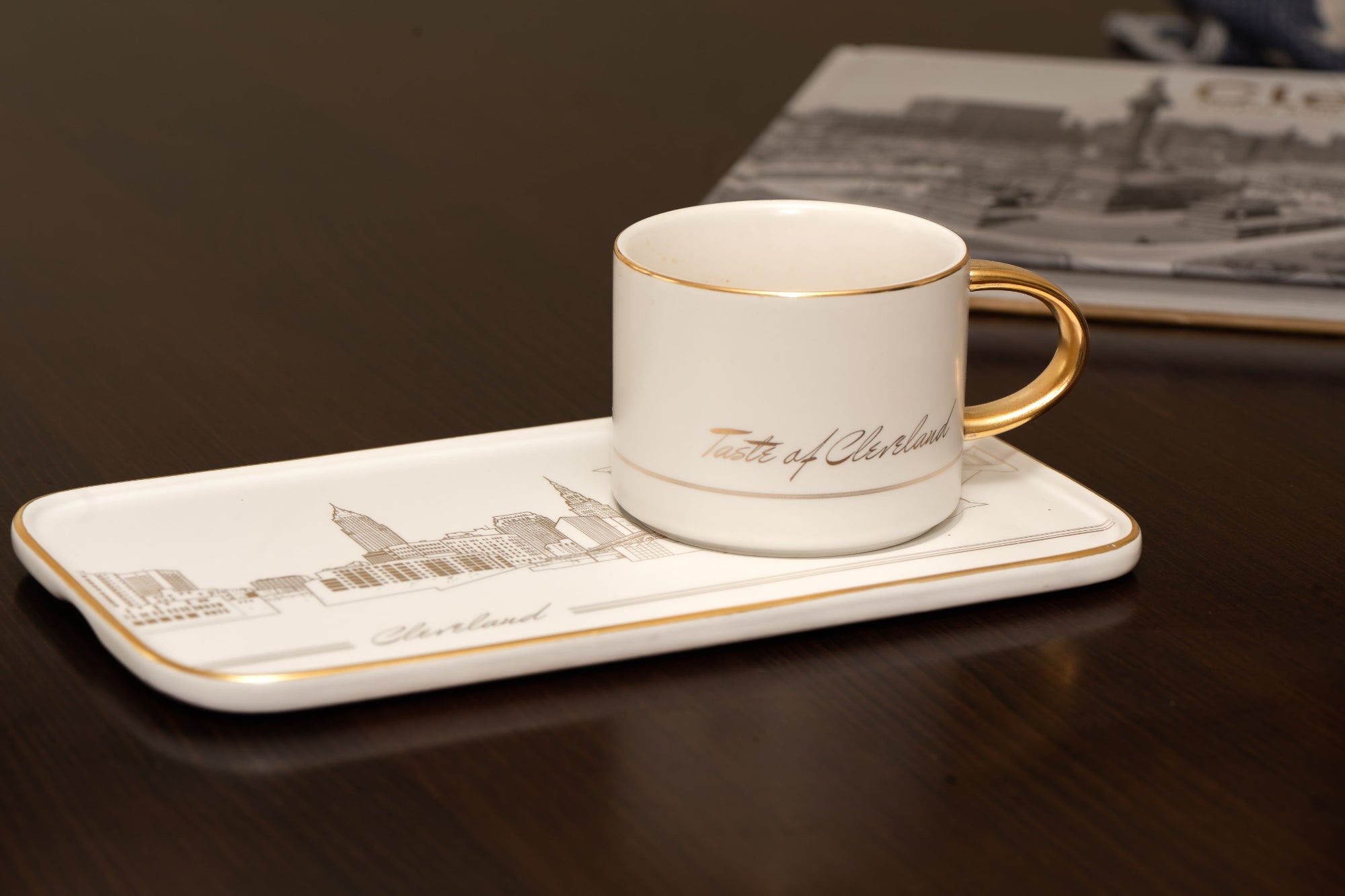 - DESIGN: The tray is adorned with a contrasting gold art-line design, depicting the Cleveland skyline. The mug reads "TASTE OF CLEVELAND" in italics.